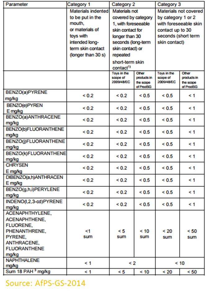 2014年,德國產品安全委員會(AfPS)在AfPS GS 2014:01 PAK的GS標志認證過程中設定了PAH測試的新要求。新標準限制 了物品和消費品中的18種多環芳烴。限制限制可在下表中找到。